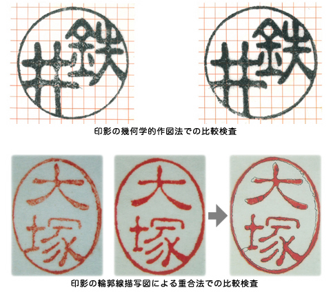 よって、印影鑑定では、各種の方法による比較検査や印顆の押印条件による印影の再現変動、印顆の製造方法による状態検査などを総合的に検討し、異同識別が可能となるものです。